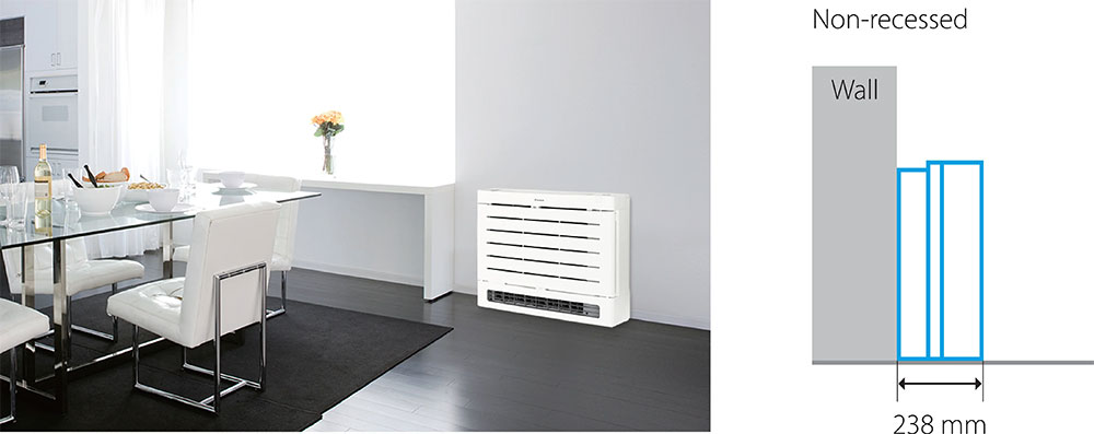 These dimensions mean a unit can easily be raised up and placed on or in a wall above the skirting board.